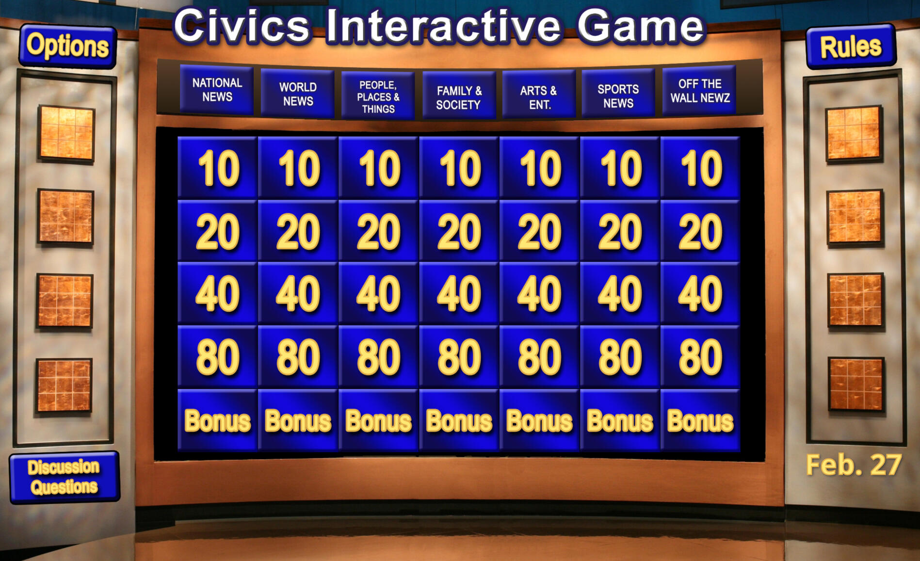 Our team of experts prepare an entire Jeopardy-style interactive game every week for you based on current events. All you have to do is set it up and let the students compete!